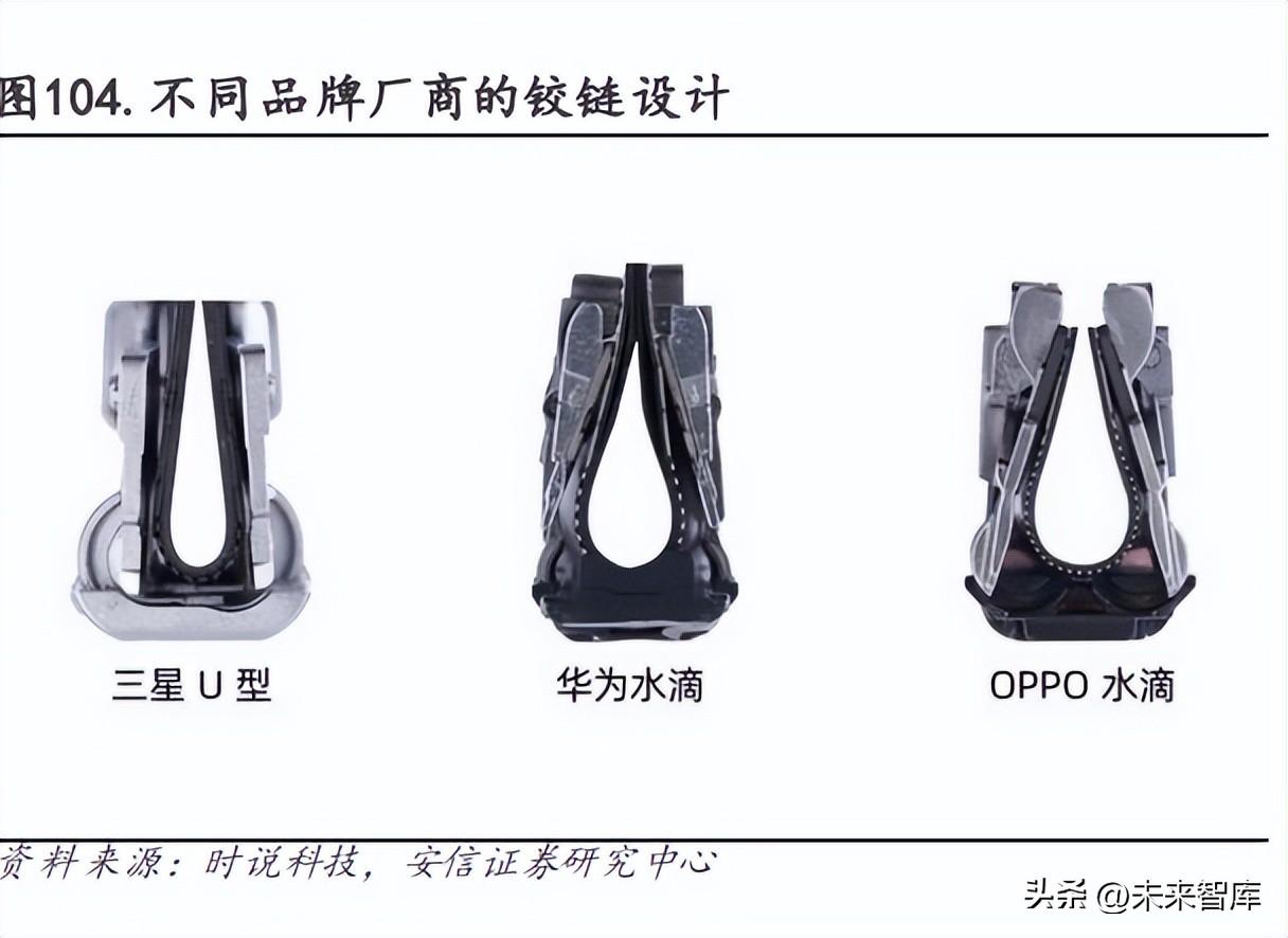 折叠屏存在折痕、缝隙等痛点,屏幕盖板与铰链技术尚有改进空间。(1)保护盖板:需要同 时满足可折叠、较好的透光性、抗刮性、折痕少等要求,当前主流方案为 CPI(无色聚酰亚 胺)和 UTG(超薄玻璃)两种。CPI 为第一代折叠屏盖板材料,具有很好的可弯曲性,大部分 手机品牌均采用该方案,但其强度、透光性、抗刮性较弱,且折痕明显,缺乏质感。UTG 相 对于 CPI 综合性能提升,但成本较高,技术难度大,目前已被三星、OPPO、vivo 等品牌使用。 (2)铰链:结构极为复杂,由上百个精密零部件组成。铰链设计直接决定了手机的闭合程度 与厚度,对折痕的形成也有影响。目前的铰链技术难以使闭合后的缝隙完全消失,影响美观 的同时,增加了手机的清理难度与刮伤风险。