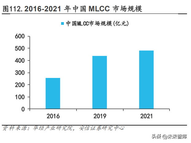 全球 MLCC 千亿级市场,中国需求占比近半。据中商产业研究院,2021 年全球 MLCC 市场规模 为 1147.19 亿元,预计 2022 年达到 1204.41 亿元。据华经产业研究院,2021 年中国 MLCC 市 场规模为 483.5 亿元,占全球总规模比例约 42%。