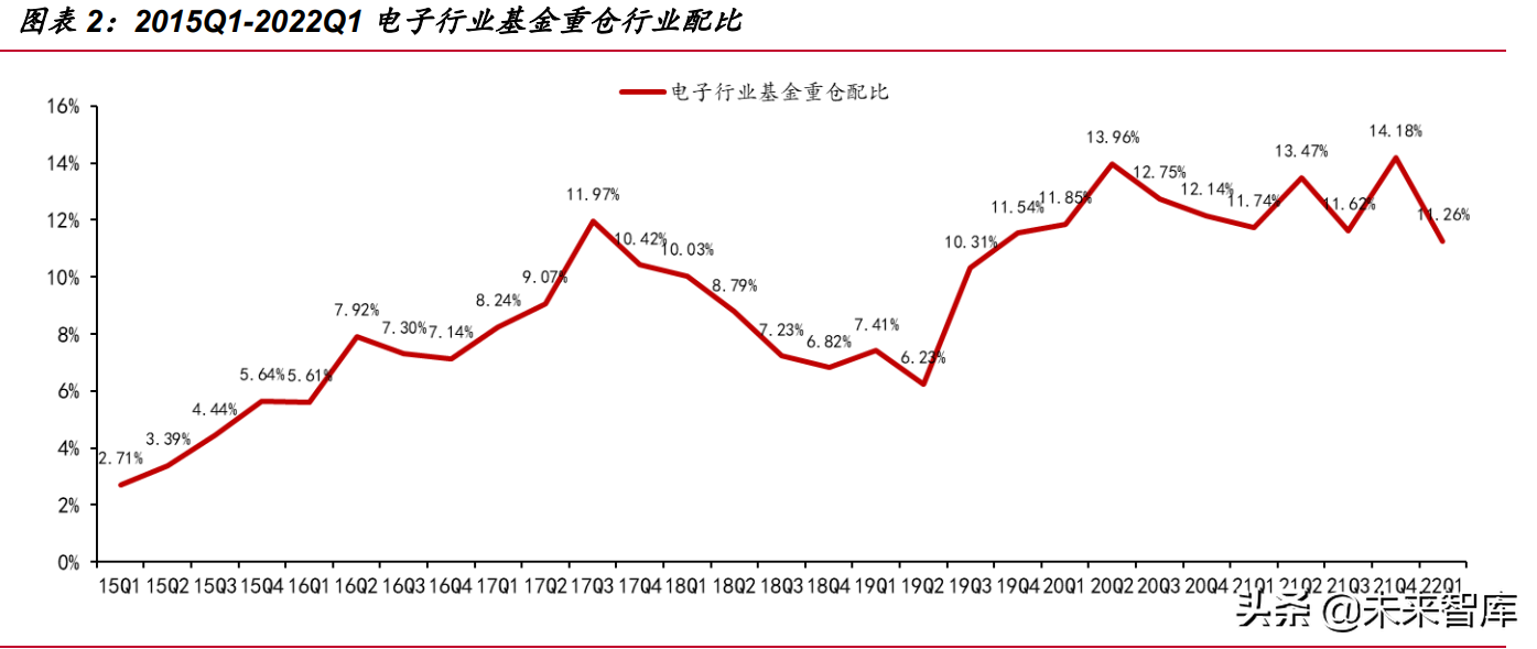 电子行业的基金重仓配比持续在高位震荡。电子板块优秀公司的不断涌现造就电 子细分领域的蓬勃发展,如立讯精密等苹果产业链企业,海康威视、小米等安防消费 类企业,京东方 A、TCL 等面板产业链企业,韦尔股份、兆易创新等半导体产业链企 业,以及模拟、功率、射频等特色工艺领域内的各类专精特新企业。基金对电子行业 的重仓比例也在不断提升中,2021Q4 创历史新高达到 14.18%,虽然短期看基金重 仓股中电子行业配比在 22Q1 有所回调,但根据过去几年的数据,基金对电子行业的 配置在短期回调后都会向上突破再创新高。短期内受国际政治、国内疫情等多重因素 影响,全球原材料供给和供应链流转都出现不利局面,导致整体制造业承压显著,但 我们认为电子工业尤其是半导体产业链仍然是整个工业生产体系最重要的参与者之一,长期看好电子行业板块。