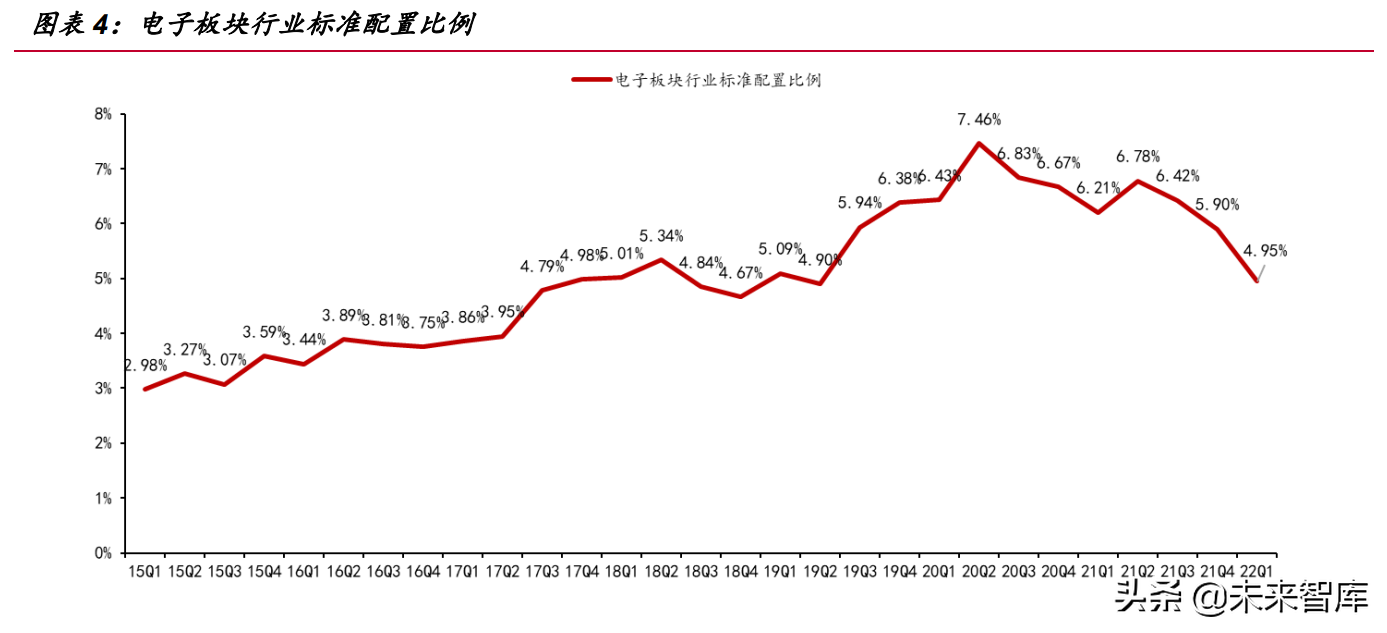 电子行业标准配比为 4.95%,连续 3 个季度出现下降。截至 2022Q1,电子行业 标准配置比例为 4.95%,环比下降了 0.95 个百分点。(标配比例计算方法:申万电子 总市值/万得全 A 总市值)