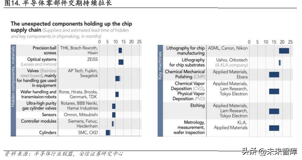 上游设备零部件供应紧张,半导体设备交期拉长。全球晶圆厂的持续扩产拉动 半导体设备及零部件需求,上游设备零部件供应出现紧张。截至目前,科磊集团、泛 林集团、阿斯麦等半导体设备大厂都已通知客户,由于镜头、微控制器、工程塑料和 电子模块等零件全都面临短缺现象,部分关键机台必须等待最多 18 个月交付,而用 于制造基板的设备甚至需要长达 30 个月的交付期。