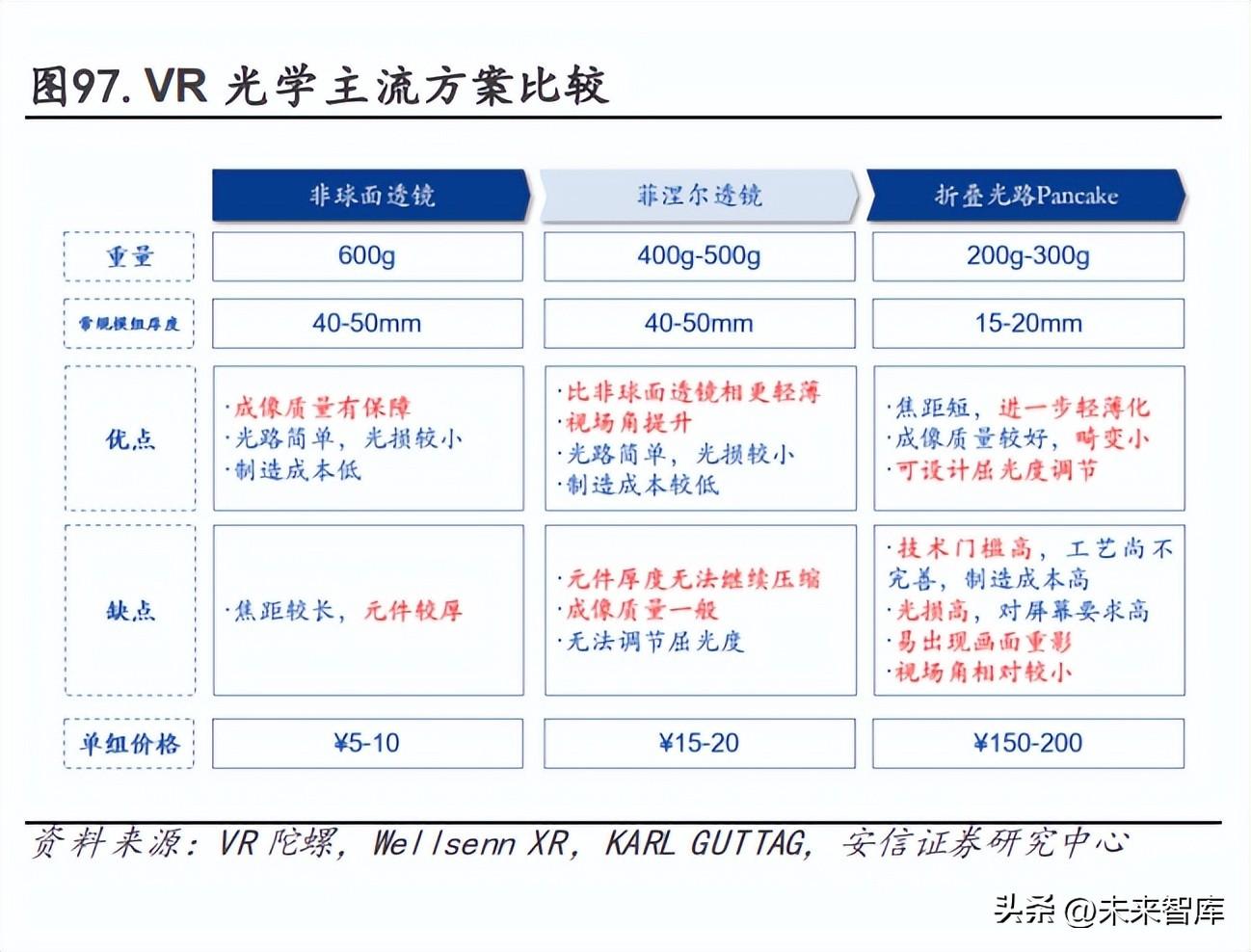 五部门发布 VR 计划,产业链迎来低位布局机会。2022 年 11 月,五部门联合发布《虚拟现实 与行业应用融合发展行动计划(2022-2026)》,给出具体量化目标,2026 年我国虚拟现实产 业总体规模超 3500 亿元,终端销量超 2500 万台,该目标销量超出此前市场预期。 文件将近眼显示技术放在关键技术融合创新的首位。近眼显示将向高分辨率、大视场角、轻 薄小型化方向发展,这需要通过光学显示硬件升级实现,相关标的包括:(1)光学端:水晶 光电、三利谱等; (2)设备端:华兴源创、精测电子等;(3)显示端:鸿利智汇等。 Pancake 有望接力菲涅尔透镜成为主流 VR 光学方案。VR 光学方案主要经历了非球面透镜、 菲涅尔透镜、Pancake 方案三个阶段,当前 VR 设备光学方案仍以菲涅尔透镜为主,Pancake 方案开始逐步渗透。Pancake 方案利用光的折射、反射和偏振原理,通过折叠式光学元件实 现更短的光路,具备轻薄化、成像质量好、可调节屈光度等优点,大幅提升了用户的体验感 和舒适度,但光损高、良率低等痛点仍待解决,因此尚未完全取代技术成熟、供应稳定的菲 涅尔透镜。目前华为(VR Glass)、松下(MeganeX)、HTC(Vive Flow)、创维(Pancake 1)、 苹果(VR/MR 头显)、Meta(Cambria)已经或有望即将推出采用 Pancake 方案的头显,预计 在科技巨头的引领下,Pancake 方案在未来将得到更广泛的应用。VR 光学作为 VR 设备的关 键环节,技术壁垒较高,目前仅歌尔、舜宇等少数厂商可提供高性能光学方案。