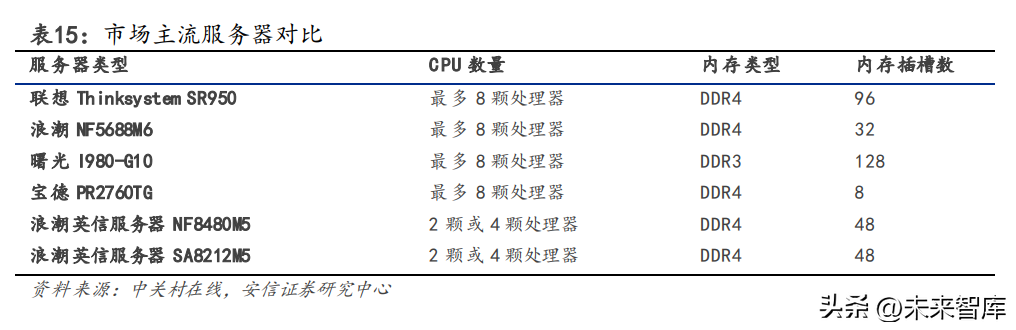 服务器性能提升,内存模组需求提升。随着服务器技术进步,以及行业数据处理需求的提高, 目前部分处理器的最大可用 CPU 数量逐渐提高,浪潮、联想等主流服务器厂商的产品部分最 大可支持 8 颗 CPU,相对过去单个服务器仅用 2 或 4 颗处理器出现了极大的进步。不仅服务 器的数量 CPU 增加,服务器所用的 CPU 通道数量也显著增加,根据英特尔的官网产品,2020- 2021 年的服务器 CPU 产品通道数基本在 6-8 个,以前的产品通道数基本为两个,说明未来服 务器多个 CPU、CPU 多通道将成为服务器行业的趋势,配套内存模组需求相应提升。