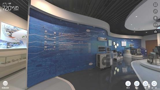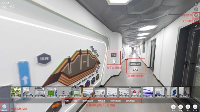 我们现在已经进入了云看馆界面,这时我们可以通过鼠标拖拽、屏幕触摸等方式进行视角的变换,点击画面中的箭头可以进行场景切换操作,点击介绍按钮可以显示场景内设施的文字介绍。同时,可以通过左下角的场景选择按钮,切换任意场景。