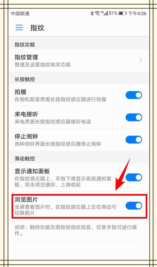 先来看看华为手机的指纹功能,它的指纹功能除了可以用于屏幕解锁之外,还有以下这些用途。很多人不知道,当我们在全屏查看图片时,可以通过在指纹感应器上左右滑动来切换正在查看的图片。是不是很方便?使用这个功能之前,记得在设置中将【浏览图片 】功能打开哟~