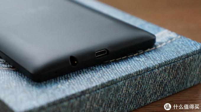 口袋阅底部左侧是 3.5 mm 耳机接口,日常可以配合耳机听书。Micro USB 接口居中,没有采用 Type-C 接口比较遗憾。