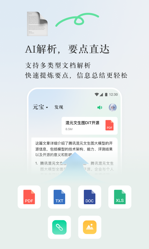 元宝支持多类型的文件、图片识别及阅读,用户可直接上传文件,快速输出要点,信息总结更轻松。