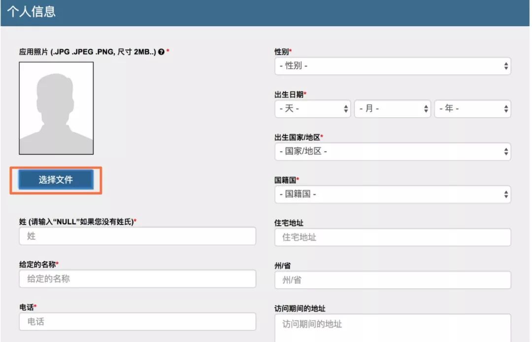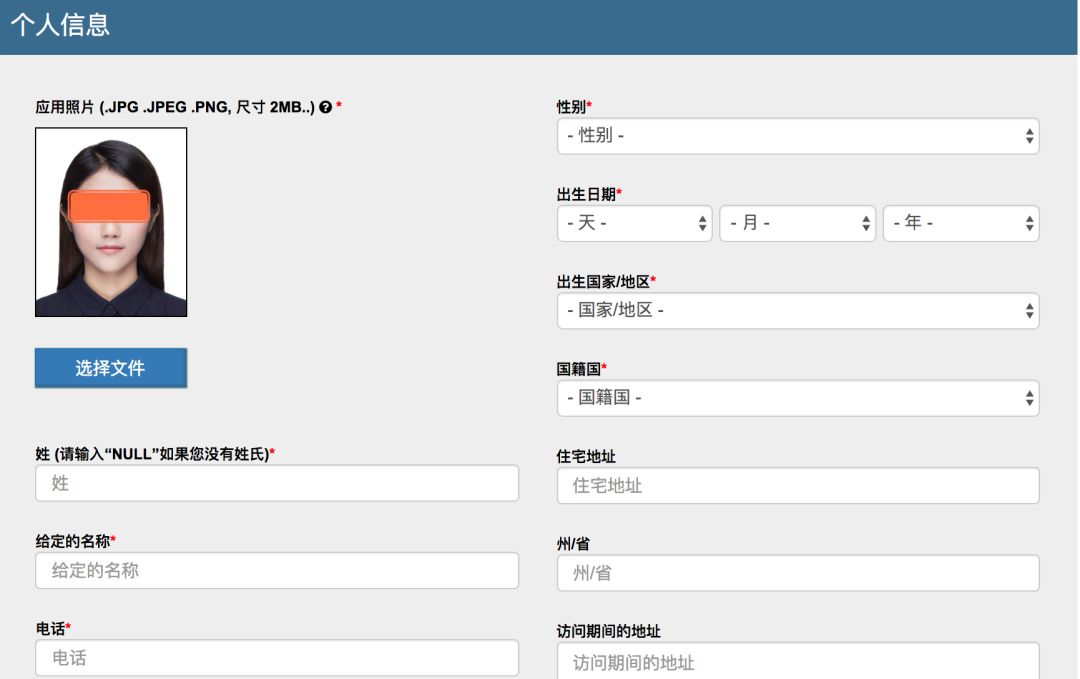 3. 详细填写个人信息:包括姓(拼音,与护照一致)、名(拼音,与护照一致)、电话、电子邮件、性别(male 男/female 女)、出生日期(日/月/年)、“出生的国家/地区”、“国籍国”可分别点击下拉菜单,选择“China”,以及访问期间地址等信息(这个地址填写酒店地址即可)