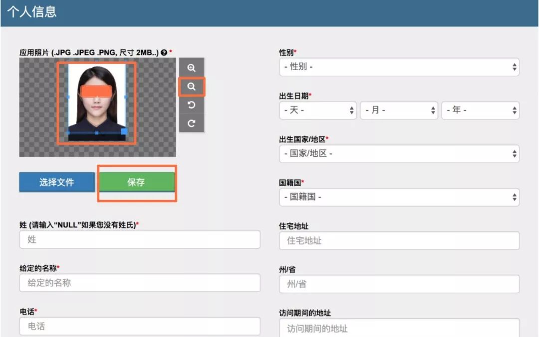2. 从电脑中选择提前存好的个人护照照片,将照片调整到合适大小后,点击“保存”,照片将显示在网页上