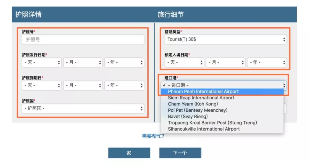 PhnomPenhInternationalAirport 金边国际机场SiemReapInternationalAirport 暹粒国际机场ChamYeam占延口岸,位于柬泰边境PoiPet(BanteayMeanchey)波贝(班迭棉吉省)口岸,位于柬泰边境Bavet(SvayRieng)巴域(柴桢省)口岸,位于柬越边境TropaengKrealBorderPost(StungTreng)上丁边防哨所,位于柬老边境SihanoukvilleInternationalAirport 西哈努克国际机场2. “柬埔寨的入境日期”,根据预期行程填写。