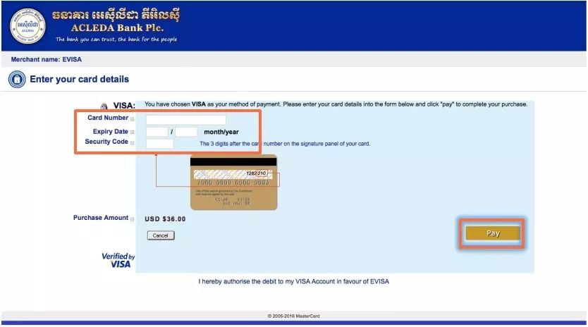 以VISA 为例,“CardNumber”中输入信用卡卡号,“ExpiryDate”按照月/年顺序输入(年仅输入后两位,如2021输入“21”即可),“SecurityCode”一般为信用卡背面签名条上的三位数字。输入完成并核实后点击右下角“Pay”(支付)完成付款。