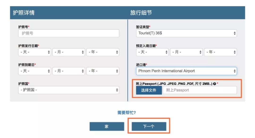 填写完整后,点击“选择文件”,上传护照照片信息页(照片 JPG 或扫描 PDF格式均可,图像清晰,大小不超过 2M),上传后点击“下一个”。