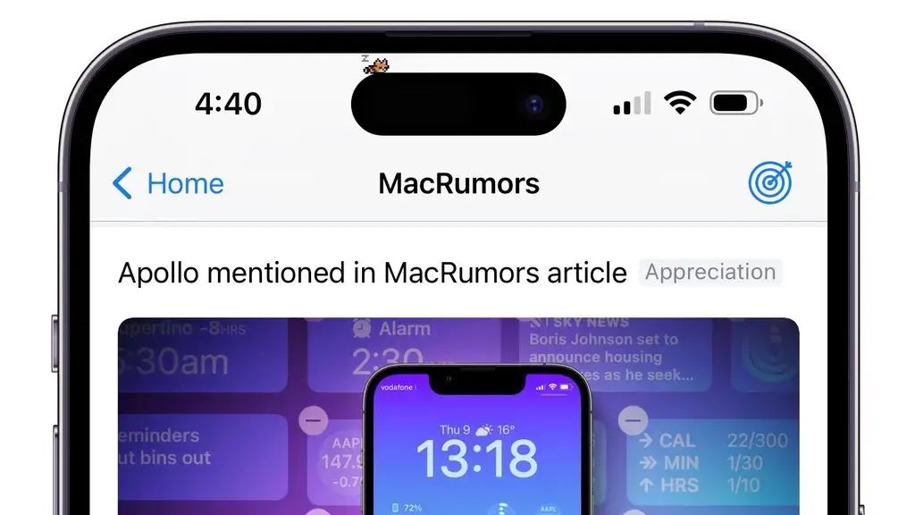 知名第三方 Reddit 应用 Apollo 在近期的版本更新中,增加了对 iPhone 14 Pro 和 iPhone 14 Pro Max 两款型号“灵动岛”功能的支持。开发者克里斯蒂安·塞利格(Christian Selig)在灵动岛上设置了一个“电子宠物”。
