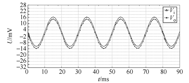 光滑曲线为输入信号,带点曲线为输出信号,由图可知,输入线与输出线基本重合,线性度较好;输入信号有效值为10mV时,输出信号有效值为9.98mV,相位误差在5′左右,满足0.5级电子式互感器对采样精度的要求。