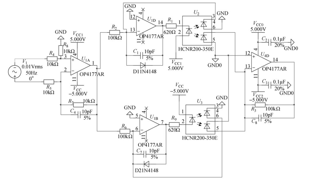 如图5所示,本设计采用高速线性光耦HCNR201进行光电隔离,它具有超低线性度(0.01%)、低增益温度系数、耐压等级高(5kV)、隔离电压高(最高隔离8kV)、单向传输、抗共模干扰能力强及信号一比一线性高速传输等优点。交流电压信号经过调理后接入光耦,光耦将夹杂在输入量中的各种干扰脉冲都挡在输入侧,具有较高的电气隔离和抗干扰能力。