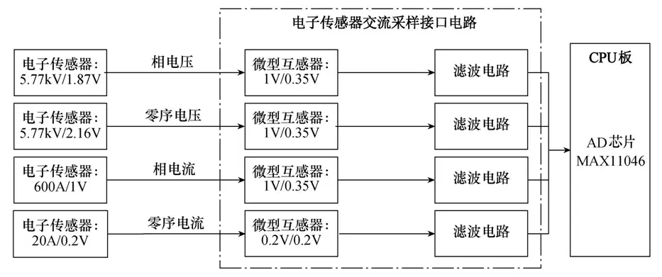 考虑到电子式电流传感器是LPCT,自带线圈隔离,但信号需经8~15m长的电缆传输;而电子式电压传感器输出信号调理回路没有任何隔离措施,故将交采回路设计为微型互感器采集,原理框图如图4所示。