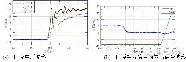 为了减少门极信号的分散性,本文通过多路光纤传输系统以确保每个触发信号到达IGBT门极时间基本相同,并选用了同一型号,同一时期,同一生产线上的器件以减少器件本身的分散性。经测试发现,各个IGBT门极信号的延时时间基本相同,误差在20ns以内。图4(b)为其中一路开关单元的触发信号和IGBT门级信号的波形图,可以看出触发信号动作到门级电压上升之间的时间约为460ns。