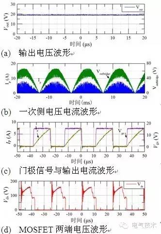 本文在满载状态下对电源进行测试,其波形如图8所示。由图8(a)可以看出电路输出电压约为18V,与设计值相符;由图8(b)可以看出一次侧电流波形的包络线为正弦,且与整流桥输出电压相位相同;图8(c)表示的是一次侧电流波形与MOSFET的门极驱动信号之间的关系,当MOSFET开通时,一次侧电流沿直线上升到最大值7.5A,当MOSFET关断时,其迅速降为0.;由图8(d)可以看出在MOSFET关断瞬间,其两端会出现一个尖峰,这是由一次侧的杂散电感和其寄生电容产生振铃效应所引起的。