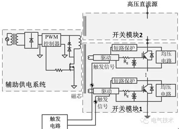 每个开关模块由多个IGBT及其辅助电路共同组成。为了实现每路开关单元的可靠供电同时减少体积,本开关设计了基于反激式开关变换器的多路隔离供电系统[6],该系统将能量通过松耦合的方式从前级传递到后级,为每个IGBT单元单独供电,且易于拓展。
