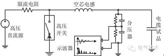 试验开始时,先通过高压直流电源对电容性试品(XLPE电缆等)充电至预设电压;然后闭合高压开关,同时切断高压直流电源,此时,电容性试品通过空心电抗器经高压开关放电,电抗器与电容性试品组成串联谐振电路,在试品上产生衰减振荡的交流电压,通常该振荡电压将持续几十个周期,约数百毫秒。当试品上电压降为零后,断开高压开关,接通直流高压电源,即可进行下一次试验。