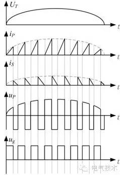 图6所示的是电路中关键点的理论波形,UT为整流桥输出电压波形,iP是一次侧电流波形,iS是二次侧电流波形,uP是一次侧电压波形,ug是MOSFET的门极驱动信号。由图6可以看出,当二次侧电流降为0时,闭合半导体开关,即电路工作于即时模式(Transient mode)。