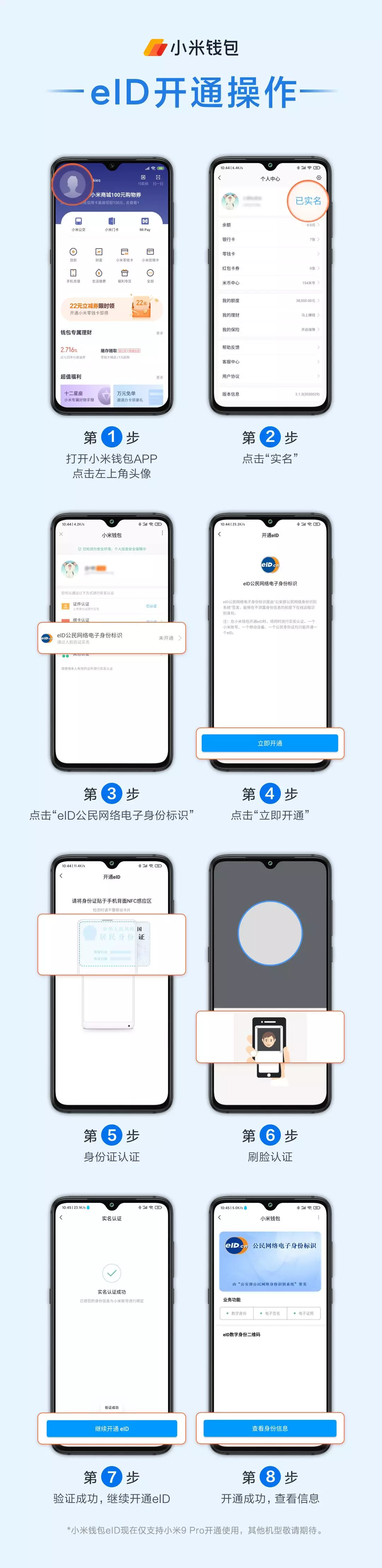 小米钱包eID现在支持小米9 Pro手机开通使用,其他机型敬请期待哦~