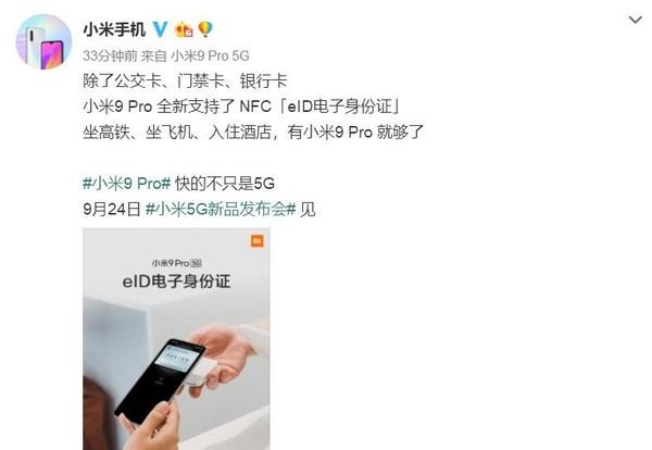 【手机中国新闻】9月22日,小米手机官微透露,小米9 Pro将支持eID电子身份证。手机上的eID电子身份证是将身份证相关的信息内置在手机中,在日常生活需要验证身份证的场景,通过NFC功能模块完成识别认证操作。比如坐高铁、坐飞机、住酒店等等场景,就非常方便。也就是说,以后出门带部手机就足够了。