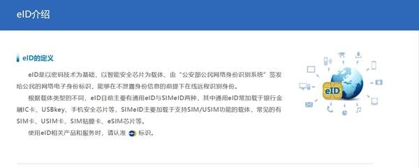 eID (electronic IDentity) 是以密码技术为基础、以智能安全芯片为载体、由“公安部公民网络身份识别系统”签发的公民网络电子身份标识,能够在不泄露身份信息的前提下在线远程识别身份。