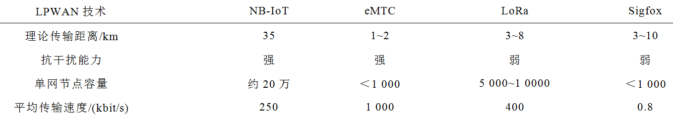 其中,随着物联网技术发展而来的LPWAN技术更是凭借其低功耗、覆盖面广的突出优势成为了关注热点。LPWAN技术根据使用频谱是否被授权,可以分为基于蜂窝技术、工作在运营商授权频谱下的窄带物联网(Narrow Band IoT, NB-IoT)技术和增强型机器类通信(eMTC),以及工作在非授权频谱的远距离无线电(Long Range, LoRa)技术和Sigfox技术,这些技术的主要性能指标对比见表2。