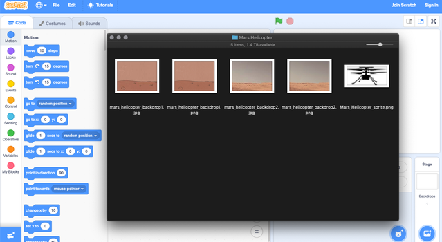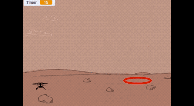 制作一款电子游戏,让游戏玩家乘坐直升飞机探索火星,就像和美国航空航天局(NASA)的“毅力”号(Perseverance)漫游车一起前往火星的“机智”号(Ingenuity)直升机一样。使用Scratch(一种可视化编程语言),像NASA的太空任务规划人员一样设计你的游戏吧!---