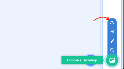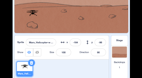 创建一个新背景:将鼠标移至右下角“舞台”(Stage)窗口中的“选择一个背景”(Choose a Backdrop)图标上,然后选择“上传背景”(Upload Backdrop)。在下载好的火星表面图像中选择你想要的图。现在,屏幕上的“舞台”区域应该显示你选择的背景图片。示例图片如下:
