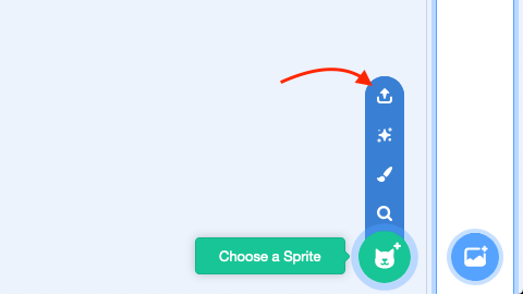 创建一个新的角色:将鼠标移至“角色”(Sprites)窗口中的“选择一个角色”(Choose a sprite)上,然后选择“上传角色”(Upload Sprite)。选择下载好的直升机角色图片。现在,你的背景图片上应该会出现一架直升机,同时还有默认的小猫角色。示例图片如下: