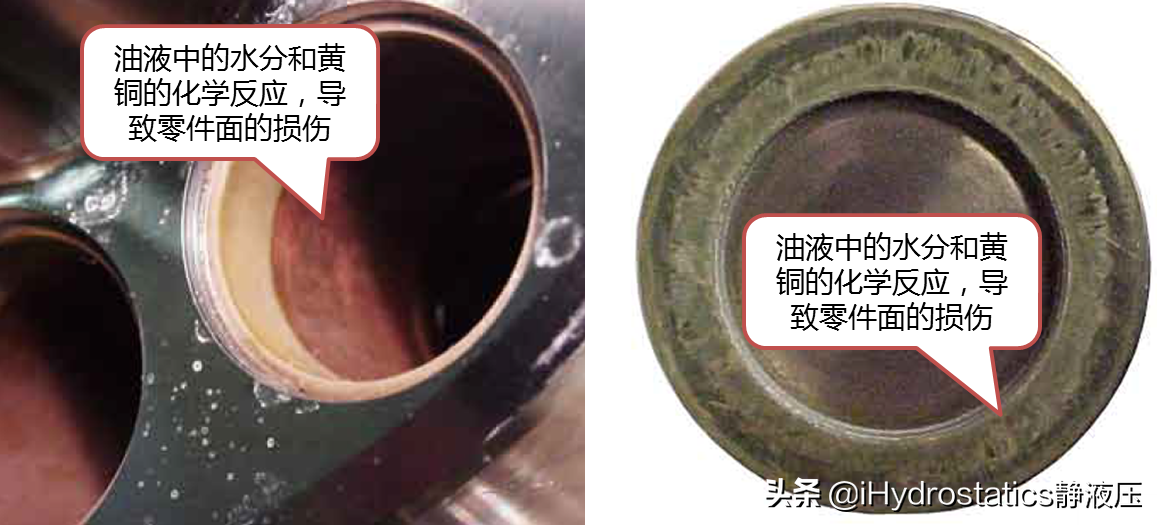 水与油液中的添加剂发生化学反应,导致油液化学成份变质。这些化学物作用于黄色金属表面,导致蚀刻效应。蚀刻效应发生的金属表面将形成高压力泄漏油道,最终可导致元件失效 [1]。