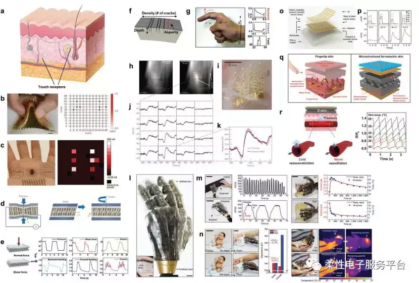各种触摸感应能力的电子皮肤可能是其中最模仿的仿生电子,包括柔性可拉伸的电子学研究。人的皮肤 是建成的最大的人体器官,这些复杂的传感器 一起工作以提供极其敏感的触摸感觉(图5a)。因为触觉感受是由 不同类型的触摸感受器的全面努力 产生的,所以创造一个完整的人工皮肤需要模仿 不止一个感觉系统。基本上, 使用电子元件成功模仿人体皮肤将包括 物理压力,应变和温度传感器,模仿 人类可以感受到的完整触感。人体 皮肤是独一无二的,因为它可以感知最微小的物理压力,同时实现变形,例如弯曲,拉伸 和压缩。此外,其区分压力 (戳刺)与应变(拉伸,扭曲和压缩) 以及同时以空间 分布的方式检测附近温度的能力表现出传感机构的复杂性和独立性。图5显示了实现这些触摸感觉的最新代表性方法。