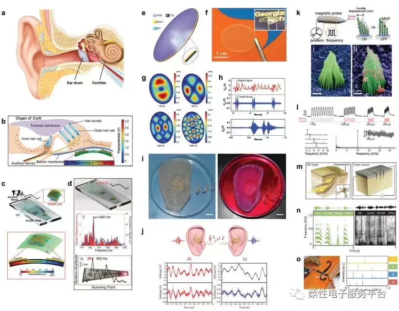 在哺乳动物的耳朵中, 声波中的气压振动导致耳膜以精确的 频率和振幅振动,这些振动通过 小骨传递到耳蜗毛细胞以转换成电信号 。 听觉系统的惊人复杂结构,特别是耳蜗系统,可以将振动 信号放大几百倍,从而即使是最微小的 声音也能被选择性识别。其他物种,如蜘蛛,蟑螂,蝎子和蟋蟀,已经进化而来 独特的感官系统,专门用于感知 各种频率的振动,与配偶交流, 探测附近的敌人和猎物。它们的振动受体 由纳米机械设计构成,其以极小的机械刺激振荡并刺激感觉神经。正如这些生物物种所证明的那样,振动是信息共享和 地方地位识别的最重要的交流通道之一。因此,患有听觉系统故障的患者具有严重的通信 问题。研究人员为发出低成本,低功耗,轻便且稳定的人工听觉系统而努力奋斗。 如上所述,听觉的生理基础 是机械感觉。与皮肤受体相反,触觉的机械感受器 具有高达400 Hz的振动感应范围,而听觉系统的灵敏度更高,范围更广振动频率检测范围(20-20 000 Hz)。通过电子设备模仿这种先进的设计需要 将精细的材料和结构与复杂的光刻图案化技术相结合。 最近的研究已经提出了新的机制和 制造方法来模仿 生物物种的听觉系统结构,使声音检测设备的 频率高达20 kHz。