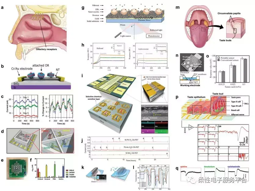 化学感受器负责产生两种气味和味觉。然而,嗅觉和味觉受体具有非常不同的化学和神经组成。在人类的鼻子里,≈400种功能性嗅觉受体(ORs)形成了各种气味传感器的复杂网络,可以检测气态的远处化学物质。人的舌头由味蕾感测物质。每个味蕾由 50-150种不同的味觉受体细胞组成,它们与 蛋白质偶联以检测苦味,甜味和尿味, 咸味和酸味。嗅觉和味觉受体系统通过向大脑传递化学信息用以检测气味和食物。 两种系统区分不同化学分子的显着能力 引起了研究人员的兴趣,他们研究了这些系统作为电子化学传感器的应用,为环境监测,食品质量/安全 评估,和医学诊断提供了潜在的应用。生物电子鼻和舌头通常由初级感知 元件和次级传感器和放大器组成,灵感来自生物化学感受器和神经系统。因此,独特的化学传感器结合了生物受体和 新型换能器,如微电极阵列 (MEAs,电化学和光学器件,和基于纳米材料的菲尔德效应晶体管(FET)证明有效将外部化学 信号转换成电信号。