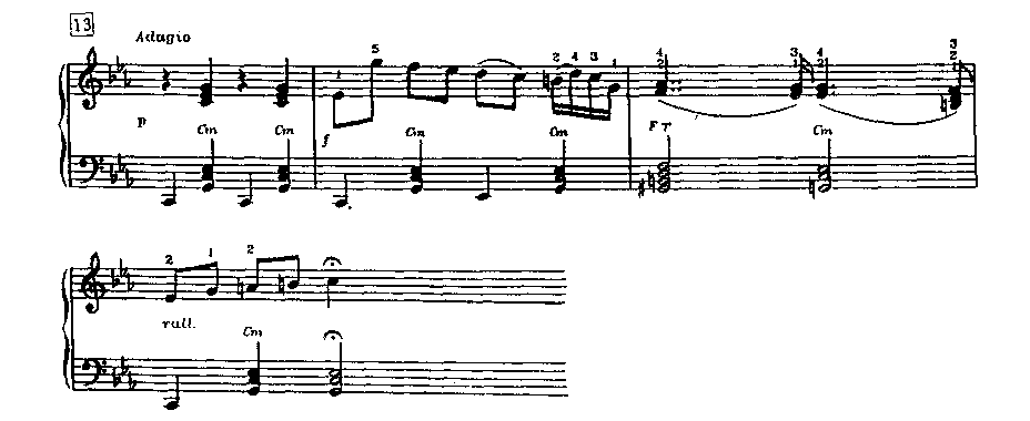 第二、记录出左手演奏的和弦实际音高或旋律,同时还标注对应的和弦符号,例如下面的《吉普赛之歌》片断谱,左手弹奏(大括号下面一行谱)的乐谱就是这样。