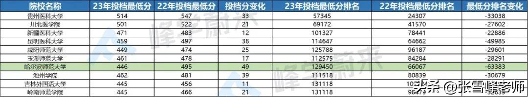2、医学类、师范类专业为代表的高校两极分化 ,院校涨幅明显的以医学类和师范类院校为主,还有部分工科类高校和财经类高校,山东、河南等地区出现频率较高;院校跌幅明显的以医学类和师范类院校为主,有不少偏远地区的高校。此分化的原因可能跟目前医学、师范过热,家长考生对未来升学考编竞争的担忧有关:为谋求发展,这个分数段的考生家长多规划考研,故倾向于选择考研热度更高、学风更扎实的地区高校作为志愿方向。