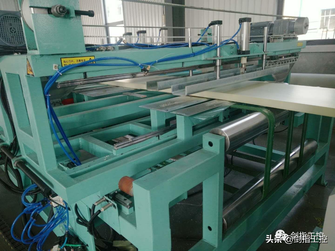 我们可以通过贝加莱 PLC 的电子凸轮功能实现追剪,一颗伺服牵引板材编码器回馈板材的长度,通过 PLC 实现长度设置。切刀固定在同步架上,切刀横移方向由普通三相异步电动机拖动,而前后方向需要与板材方向同步因此由我们可以由另一个伺服拖动。同步架安装位置见下图。