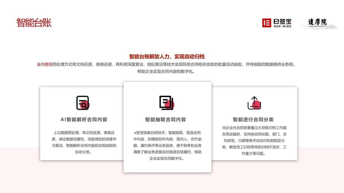 从这个美好的愿景出发,e签宝很早就意识到AI+电子签名的应用前景,并将其作为产品研发与技术革新的重点方向。当前,e签宝基于AI技术打造的智能合同解决方案,围绕企业从合同签署到管理每个环节的痛点,开发了一系列智能化功能,在降本增效的同时,也促进业务、法务部门相互协同,大大增强企业合同风控与管理水平。