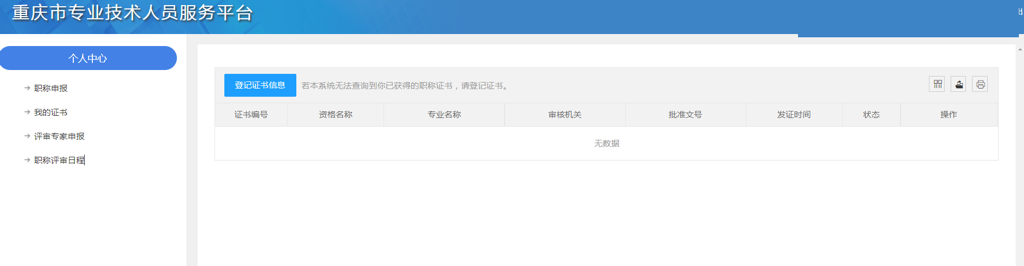 登录“重庆市专业技术人员服务平台”,首次登录需先完成用户实名制注册。 点击“职称”板块,在“个人中心”,进入“我的证书”选项,点击“登记证书信息”,按步骤进行证书信息登记。