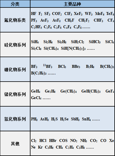 电子气体是特种气体的一个重要分支,是超大规模集成电路、平面显示器件、太阳能电池,光纤等电子工业生产不可或缺的原材料,广泛应用于薄膜、蚀刻、掺杂、气相沉积、扩散等半导体工艺。在国家发展改革委《产业结构调整指导目录(2011年本)(修正)》中,电子气体被列入国家重点鼓励发展的产品和产业目录。其主要种类见表2。