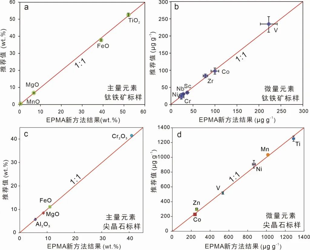 图3 电子探针高精度测试尖晶石和钛铁矿微量元素准确度