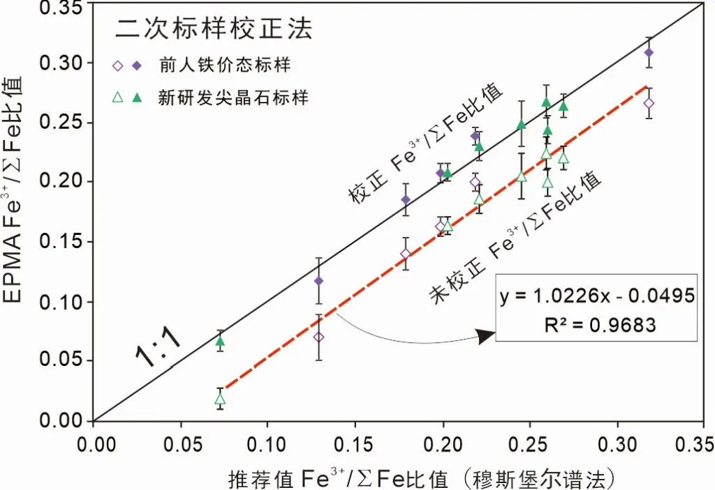 图4 电子探针二次标样校正法测定尖晶石Fe3+/ΣFe比值