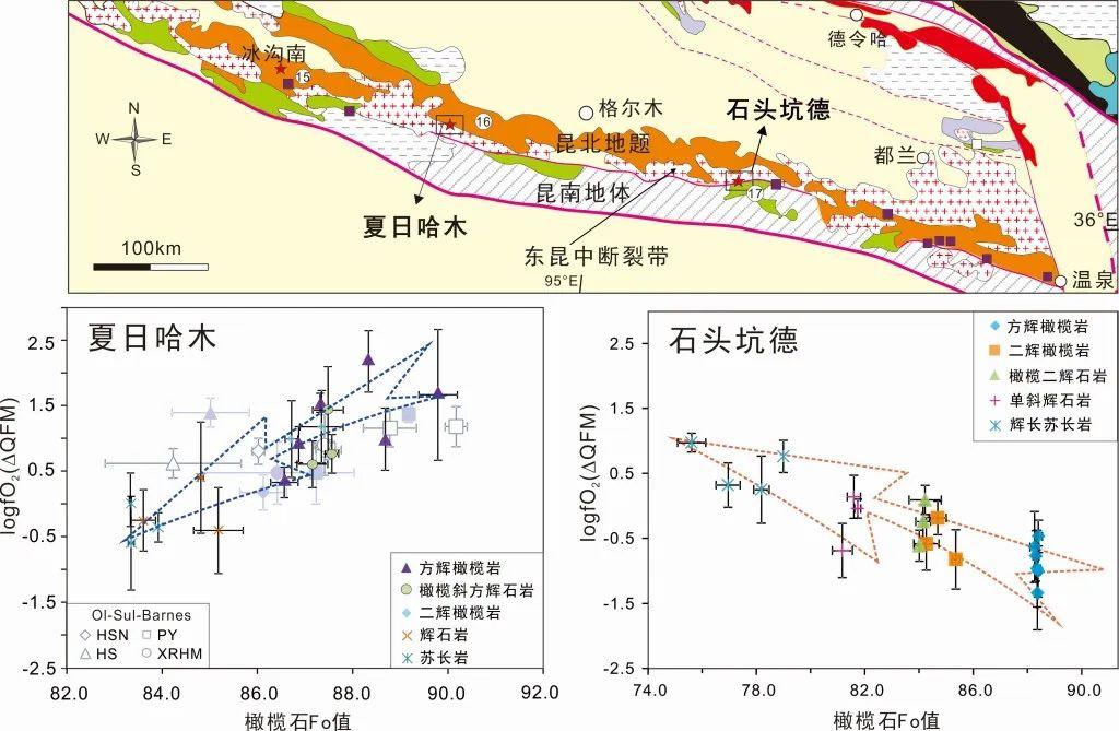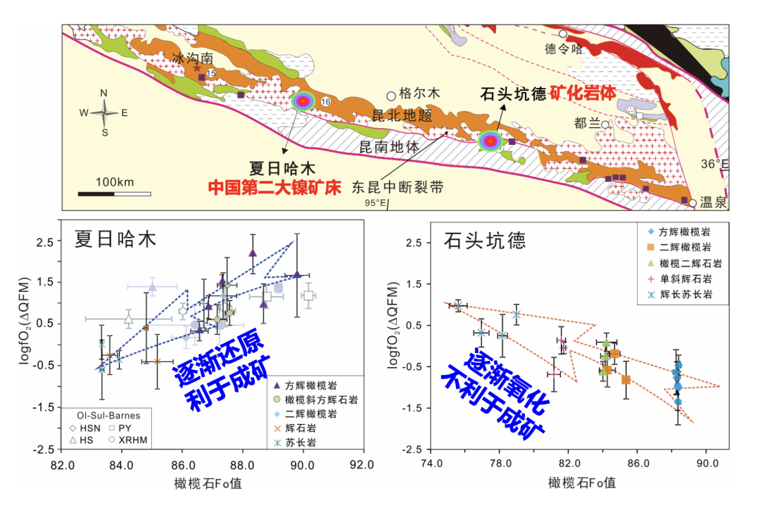 该研究团队进一步将该技术应用于铜镍矿床研究中。氧逸度是控制硫化物矿床成矿的关键因素。目前国际上主要利用橄榄石-硫化物Fe-Ni平衡计算铜镍矿的氧逸度,即硫饱和这一阶段的岩浆氧逸度。然而,岩浆从地幔源区熔融到浅部成矿,经历了一系列的氧逸度变化,如何准确限定该氧逸度变化过程,以及该变化如何影响成矿过程,尚缺乏深入研究。为了厘定岩浆铜镍成矿的关键环节,他们选取东昆仑造山带夏日哈木超大型镍铜矿(中国第二大镍矿床)和石头坑德弱矿化-无矿超镁铁质岩作为研究对象(图5),利用电子探针同时测定尖晶石主、微量元素及Fe3+/ΣFe比值,并对比不同岩浆演化阶段的氧逸度特征。结果表明,夏日哈木镍铜矿中最高Fo值的方辉橄榄岩具有高氧逸度值(QFM+2.2),表明最初始的岩浆形成于氧化环境。随后岩浆氧逸度逐渐降低(QFM-0.6)(图5),导致岩浆中硫过饱和以致发生硫化物熔离,最终成矿。石头坑德岩体的氧逸度演化恰恰相反,随着岩浆演化从还原逐渐变为氧化状态(QFM-1.3至QFM+1.0),致使岩浆中硫的溶解度逐渐增高,导致硫能达到饱和,这可能是石头坑德岩体无法成矿的主要原因。该研究揭示岩浆还原过程是铜镍硫化物矿床形成的关键环节,提出以尖晶石为新的视角,监测岩浆氧逸度的演化过程可作为评估岩浆铜镍成矿的重要指标。