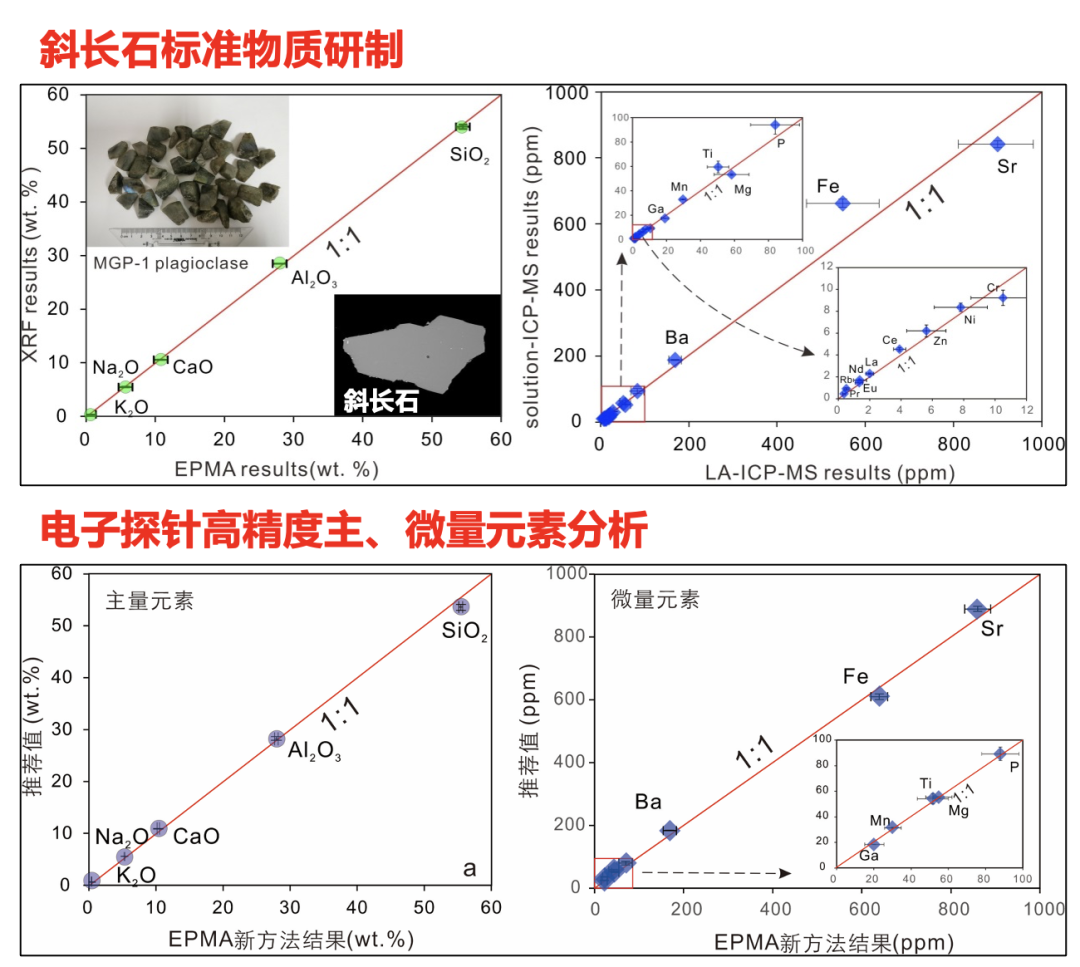 针对上述问题,本实验室在研发了MGP-1斜长石标样基础上,建立了电子探针微量元素分析方法。与常规方法相比,该方法具有以下显著优势 :