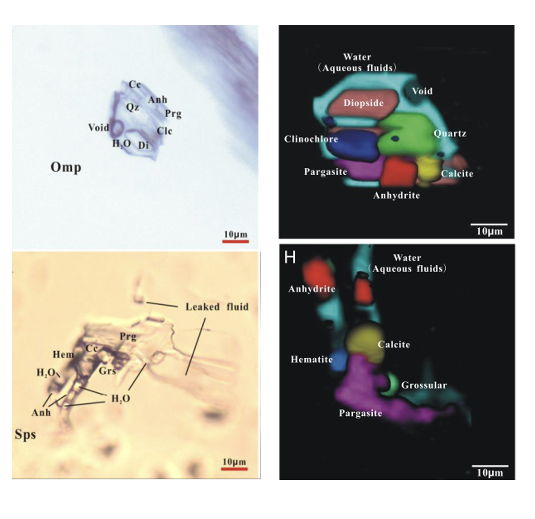 针对上述问题,本实验室通过显微原位拉曼光谱三维扫描与建模技术,对碧溪岭超高压脉体中绿辉石和石榴石的多相流体包裹体进行三维建模研究,重建了被捕获流体的成分,确定了深俯冲过程中释放的超临界流体的定量组成,讨论了超临界流体在俯冲带深部碳硫循环过程中所发挥的巨大作用。