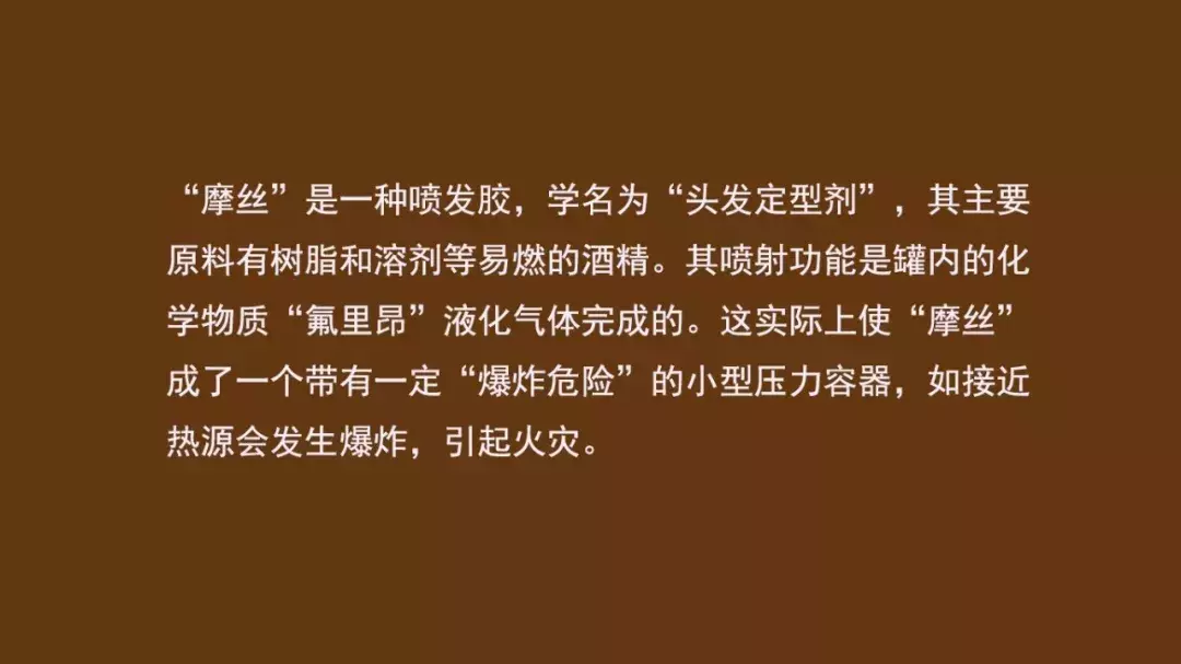 这其实是我大学读书时候,教材料学的老师教授的,喷胶摩丝之类日化用品都含有酒精,是极度危险的化学品,遇火就着。特殊情况下,喷射的摩丝发胶遇到火苗立即就可以变作可怕的喷火筒,所以,这就是为什么民航客机严禁携带这些日化品的原因。