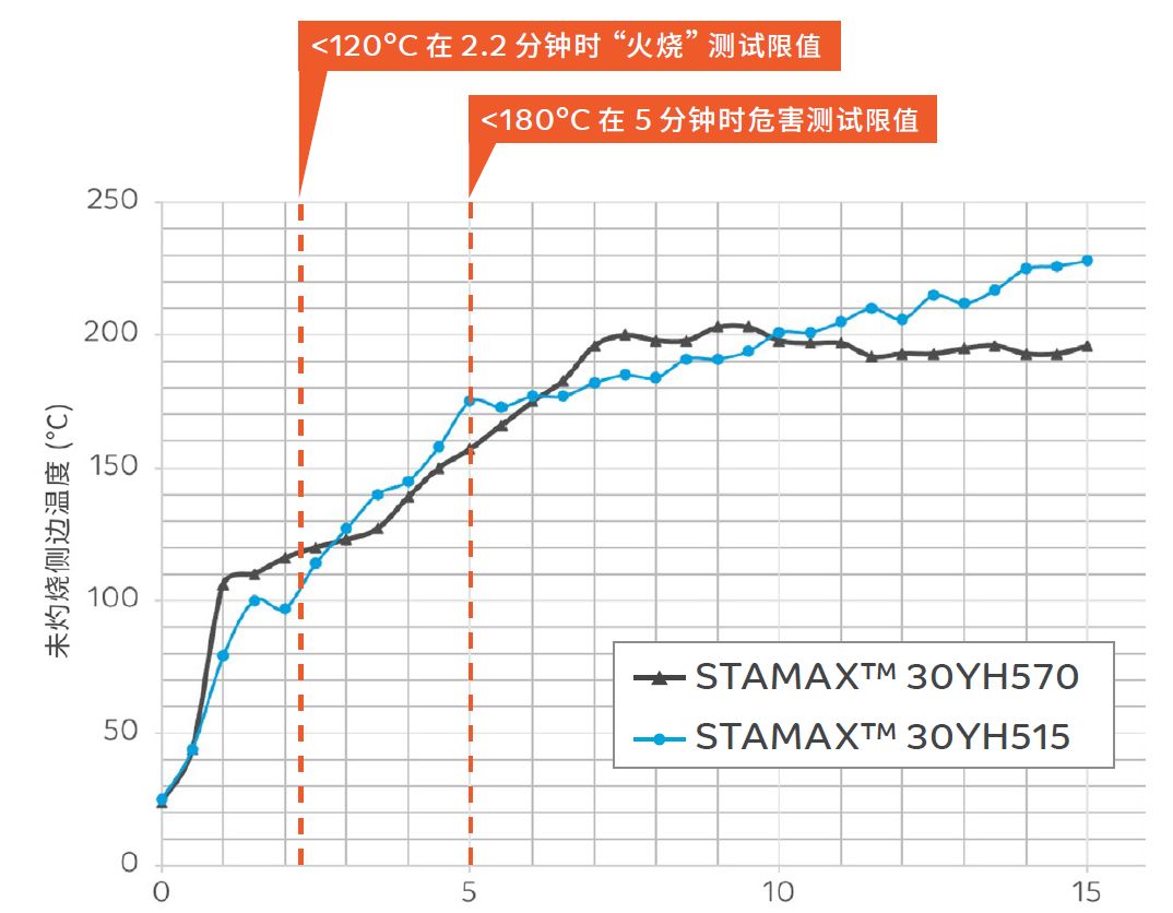 下方的图表示出了 4 mm 加筋板结构板材未被灼烧一侧的温度曲线,两种板材分别由 STAMAX™ FR 30YH570 和 30YH515 树脂制成,测试条件为水平放置(测试条件 D),灼烧温度为 1,100ºC。
