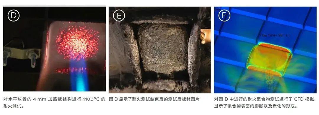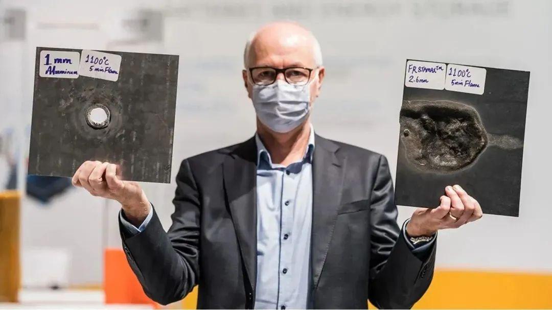 如上图,一位团队成员拿着两块板材:一种为铝制(左侧),另一种采用 STAMAX FR 树脂制成。我们均在超过1,100ºC 的条件下对两种板材进行了时长为 5 分钟的燃烧测试。铝板在 30 秒内被烧穿,而采用 STAMAX 树脂制成的板材在 5 分钟后也未被烧穿。